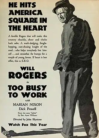 Too Busy to Work is a 1932 American drama film directed by John G. Blystone, written by Barry Conners and Philip Klein, and starring Will Rogers, Marian Nixon, Dick Powell, Frederick Burton, Charles Middleton and Louise Beavers. It was released on December 2, 1932, by Fox Film Corporation.[1][2][3]