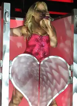 The group have performed the song on their four tours, the Spiceworld Tour, the Christmas in Spiceworld Tour, the Return of the Spice Girls and the Spice World – 2019 Tour.[61][62][63][64] It remained in the group's live set after Halliwell's departure at the end of the European leg of the Spiceworld Tour; her parts were taken by Bunton. The performance at the tour's final concert was included on the video album Live at Wembley Stadium, filmed in London on 20 September 1998.[65] During The Return of the Spice Girls Tour, the group dressed in tuxedos and performed an uptempo jazzy version of the song, while doing a striptease behind neon pink-coloured, heart-shaped doors.[66][67]