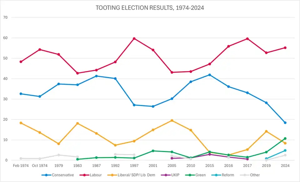 Held by Labour since its creation, Tooting was a target seat for the Conservatives at the 2010 general election after the party made gains in local elections. However, Sadiq Khan was able to retain the seat for Labour. The Conservatives have generally performed best in the northern half of the seat (Bedford, Earlsfield, Nightingale, Wandsworth Common), whereas Labour are strongest in the southern half, which covers Tooting ward itself, Graveney and Furzedown.
