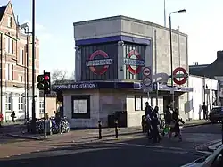 The narrow satellite building on the east side of the junction provides pedestrian subway access to the station and is unusual in that it has a large glazed roundel on each of the three panels of its glazed screen, as normally the Morden extension stations have the roundel in just the centre panel. For many years the northern panel of the screen was the sole example on any of the Morden extension stations to retain the 1920s "UNDERGROUND" lettering, the other stations' screens having been replaced with plain glass over the years. All the stations have now had the original motif replaced along with the flag-pole-mounted roundels that had been removed in the 1950s.