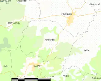 Tordères is located in the canton of Les Aspres and in the arrondissement of Perpignan.