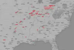 ![]() Map of confirmed tornadoes during the outbreak (indicated in white) and tornado warnings issued during the outbreak (indicated in red). | |