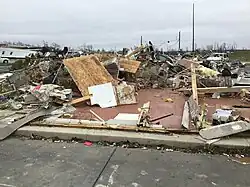 | Two metal buildings had most of their roofs removed and all their garage bay doors blown out. The buildings' exterior walls were partially removed. Several buses inside sustained significant damage from debris. Building material was pulverized and embedded in the ground and walls of buildings downwind. A nearby metal building also sustained roof damage. A few large hardwood trees were also uprooted.[27] | |||||||