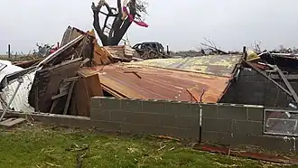 A significant tornado outbreak occurred across parts of the United States and Canada in mid-June 2014, with destructive tornadoes touching down across parts of Nebraska, Wisconsin, South Dakota, Montana, and Ontario. The event began on June 16, when a cyclic supercell thunderstorm produced a violent EF4 tornado that devastated the small town of Pilger, Nebraska. A school, a church, and numerous homes were destroyed in Pilger, one person was killed, and 16 others were critically injured in town. An identical EF4 tornado paralleled the path of the main Pilger tornado and caused a fatality in a vehicle, caused major damage to farmsteads, and debarked many trees.[44] The same parent supercell also produced two other large EF4 tornadoes that passed near the towns of Stanton and Wakefield, sweeping away multiple farm homes and lofting vehicles for hundreds of yards through the air.[45] The town of Platteville, Wisconsin was hit by a damaging EF2 tornado later that evening, while an EF1 tornado also moved through another part of town simultaneously. Significant damage to homes, an apartment building, the University of Wisconsin–Platteville campus, a gas station, power lines, and many trees occurred throughout Platteville. Strong tornadoes continued touching down into the early morning of June 17, as an EF2 ripped roofs off of homes in residential areas of Madison, Wisconsin, while an EF3 severely damaged a school and multiple homes in Verona.[46] Later that day, an EF3 tornado tossed several cars, obliterated a mobile home, and swept away a one-room schoolhouse in a rural area near the Custer National Forest in Montana. A massive and slow-moving EF3 wedge tornado occurred near Coleridge, Nebraska as well, scouring farm fields, and destroying a few farmsteads and a dehydration plant. In Canada, an EF2 caused significant damage to homes in Angus, Ontario as well.[47] On June 18, additional intense tornadoes occurred across parts of South Dakota, including a highly photogenic EF4 tornado that swept away a farmhouse and debarked trees as it passed near Alpena. A high-end EF2 also hit the town of Wessington Springs, resulting in major damage. Two fatalities occurred as a result of this outbreak, which produced 76 tornadoes.[48]