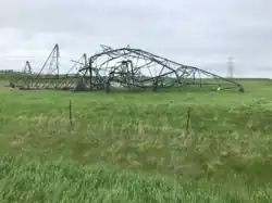 Just to the northwest, an EF3 tornado near Altamont destroyed outbuildings threw a grain bin 1 mi (1.6 km) from where it originated. The strong tornado also toppled and mangled metal truss transmission towers and ripped the roof off a house. Two other EF2 tornadoes passed near Elbow Lake, Minnesota, snapping wooden power poles and trees, and damaging or destroying grain bins and outbuildings. A strong multi-vortex EF2 tornado caused major damage to homes in Forada, some of which had roofs and exterior walls ripped off. Vehicles were tossed, and numerous large trees were snapped in town before the tornado weakened and hit Nelson, causing less severe damage to trees and structures there. Another EF2 tornado that touched down near Aldrich ripped the roof off a cabin and collapsed one of its exterior walls, snapped trees and power poles, and flipped pivot irrigation systems. Numerous other weaker tornadoes also touched down across South Dakota and Minnesota that afternoon and evening as well, including an EF1 tornado that damaged businesses and a baseball field in Deer River. Farther north in Canada, an (C)EF2[note 2] tornado moved through remote forested areas near Boffin Lake in southwestern Ontario, snapping and uprooting numerous trees along its path. Large hail and straight-line winds from the severe storms also caused considerable damage. In all, 27 tornadoes were confirmed, none of which resulted in any fatalities.[79][93][94]