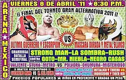 - ^ a b c d e f g h i j k l m n o p q Ruiz Glez, Alex (March 26, 2011). "Arena México (resultados 25 de marzo) Último Guerrero y Escorpión a la final de la gran alternativa 2011 ¿Goto y Rush inician rivalidad?". SuperLuchas (in Spanish). Retrieved April 10, 2011.