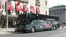The Airport Express used H345 Prevost Car 45' motor coaches with seating for 56. They were powered by engines that produce 55 per cent less nitrogen oxide and 90 per cent less particulate matter than the previous models. The coaches also have improved features, including leather seats, free WiFi internet, laptop plugs and retractable seat belts.[6]