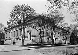 On 8 September 1909, TPL officially opened the Toronto Reference Library at a building on the northwest corner of College and St. George streets.[3] The Beaux-Arts styled building was designed by Wickson & Gregg and Alfred H. Chapman.[3] The building was the largest Carnegie-funded library built in Ontario. When the reference library first opened, its collection contained 97,788 books.[2] In addition to the reference library, a TPL branch with a circulating collection was completed in the basement of the building in 1930, and was opened on 21 April.[3]