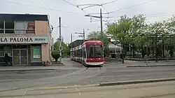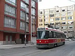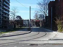 McCaul is an anticlockwise loop northeast of McCaul Street and Stephanie Street. It is the western terminus of the 502 Downtowner and a turnback point for the 501 Queen in either direction. Streetcars travelling both ways on Queen can turn north onto McCaul and then can turn into the loop, exiting onto McCaul southbound to return to Queen either eastbound or westbound. The loop was originally in the open air, but was covered when the Village by the Grange mixed-use development was built over it in 1976.[7] The minimum radius of curvature for this loop is 13.7 m (45 ft).[2]