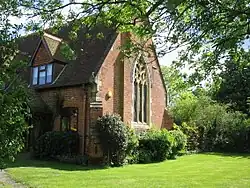 The village expanded in the mid-19th century with the building of an Anglican church, Holy Trinity, and an adjoining National School. The church was built in 1862 in the 14th-century style and is constructed of red brick with stone dressings and a tiled roof, the architect was John Turner.[3] The stained glass windows "of a simple grisaille pattern" and fittings were designed by William White.[4] Within five years the church was so overcrowded that a south aisle was built, paid for by public subscription including a donation from Queen Victoria.[5]