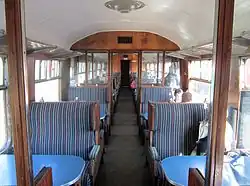 The Mark 1 TSO contains sixteen seating bays of four seats each, three transverse entrance vestibules, and two toilets arranged either side of a central corridor leading to the gangway at one end. The sixteen bays are distributed along the coach in two saloons of eight bays either side of the almost-central door vestibule (this is slightly offset towards one end by the presence of the toilets at the other end), and the saloon nearest to the toilets is further divided into two saloons of four bays each by a transverse partition. The bay spacing is 6 ft 6 in (1.98 m), this being the standard for Mark 1 Third / Second / Standard class, and identical to the compartment spacing in Mark 1 side corridor stock.