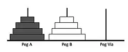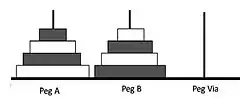 - Move one disk from peg A to peg B or vice versa, whichever move is legal.