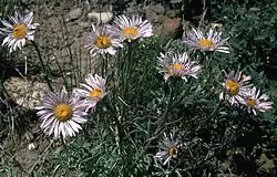 The genus is known commonly as Townsend daisies or as grounddaisies.[4][5] These annual, biennial and perennial wildflowers are native to western North America, frequently at high elevations. A number of taxa are tall, erect plants, like typical daisies. Others form small, dense, leafy rosettes, or have a more sprawling, prostrate appearance. Frequently, the flower heads are showy and attractive, with the ray florets in shades of pink, purple, blue, white, and, rarely, yellow.[6]