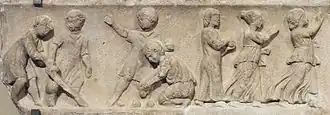For Roman children, another common variety of gambling in Ancient Rome involved the usage of nuts. The Latin phrase Nuces relinquere, “to leave the walnuts behind,” metaphorically referred to abandoning childhood and entering maturity.[56][57] Imagery on Roman child sarcophagi depict children playing with toy nuts. Depictions from a mid-3rd century sarcophagus in Ostia portray groups of young boys playing with nuts; two are fighting over a toy nut while another prepares to throw a nut.[58] Another child sarcophagus dated to the late 3rd century depicts groups of young girls and boys engaged in play with toy nuts. The boys are depicted with more active play: they grab, touch and restrain each other; one boy is depicted with his tunic falling off. In contrast, the young girls are portrayed as more organized, less active, more well-kempt, and more sedentary; they are not physically active, unlike the boys.[59]