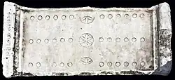 One popular dice game was known as Ludus Duodecim Scriptorum or Duodecim Scripta,[76] meaning Twelve Lines, Twelve Signs, Twelve Points, or Twelve Writings.[77][78][79] Rounded bone pieces were used to play this game. They could be a variety of colors: blue, black, green, or red. Each player had 15 pieces and placed them on a playing table divided into three horizontal lines with 12 spaces.[80] Some boards used squares, letters, lines, circles, monograms, crescents, or crosses instead of boxes. It was also common for boxes to contain six-letter words. Collectively, a Duodecim Scripta board could contain 36-letter hexagrams detailing the circumstances surrounding the game.[81] The playing tables, known as the alveolus, were typically made from limestone or marble. Although, leather and wood were also used. Wooden boards were likely common in ancient Rome. However, few have persisted in the archaeological record.[81] Although the exact rules of the game are unclear, it likely resembled backgammon. The movement of pieces was likely determined by the rolling of the dice. Each piece may have started on the left side of the board, then shifted to the right, and proceeded to move counterclockwise.[82] The players aimed to move all of their pieces around the board.[83]