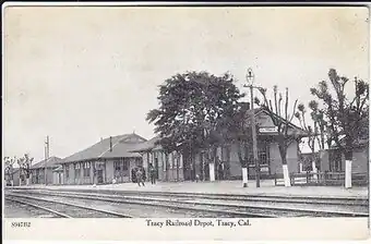 Tracy was a railway station in Tracy, California. When Southern Pacific built their new railway line around Suisun Bay in September 1878, the connection was made at a point three miles east of Ellis – the junction and town built around it were named Tracy.[1][2] The West Side Line was built from here, with service starting in 1892.[3] Southern Pacific moved their operational headquarters to Tracy from Lathrop in 1894.[4]