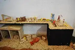 The most common traditional toy still made are miniatures, generally reproductions of real world people, creatures, and objects, sold as collectibles.[31][32] They have toy bows and arrows, cooking utensils, other tools.[2] They made in a wide variety of materials including clay, wood, metal.[31] They can be sold individually or in sets, generally to depict social scenes such as weddings, bullfights, battles, baptisms, and more.[31] One important creator of miniatures was Angel Carranza, born in Tlaquepaque in 1901, whose work is mostly done in glass. These include sets that recreate weddings, baptisms, market scenes, bullfights, charreadas as well as Nativity scenes.[32] Mexican toys are also often rich in ethnographic information. Miniature market scenes, similar to those made by the Aguilar family in Ocotlán, Oaxaca, and ceramic bands from Michoacán and Guerrero are often models of real-life equivalents, thereby making them invaluable tools for a better understanding of Mexican culture.[11] Specialty miniatures include musical instruments from Ixmiquilpan, miniatures in glass from Toluca and Guadalajara, miniatures woven from palm fronds in Chigmecatitlan, and those carved from peach and other pits in the form of animals.[31]