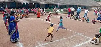 Players attempt to run between the four corners of a square without being tagged by the denner, who is in the middle of the square.[78] In a Telugu variation of the game, Nalugu Stambalata, there is a pole in each corner of the square that the players must touch.[9] In Maharashtra, the game is known as "Khamb-Khambolya".[113]