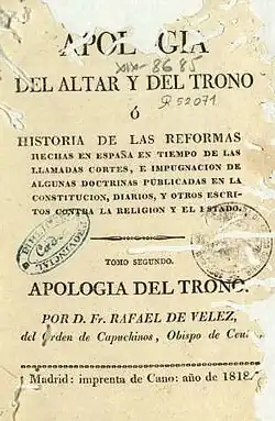 - ^ full title Apología del altar y del trono ó Historia de las reformas hechas en España en tiempo de las llamadas Cortes, é impugnacion de algunas doctrinas publicadas en la Constitucion, diarios y otros escritos contra la religion y el Estado
