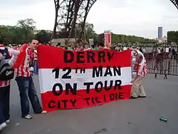By Irish footballing standards, Derry City have a relatively large and deeply loyal fan-base. Upon the club's entry into the League of Ireland in 1985, crowds of 10,000 regularly flocked to the Brandywell to see their team. The "red and white army", as they are known in reference to the club's red and white colours, are regarded as being one of the largest, noisiest and most colourful groups following a team in the League of Ireland.[1][2] Derry's average home attendance of 3,127 was the highest of any league team for the 2006 season and they are known to bring substantial numbers to away games, despite their isolation in the north-west. Furthermore, the highest attendance in the Premier Division was the last-night-of-the-season meeting between Derry City and Cork City FC at the Brandywell on Friday 17 November when 6,080 watched Derry exact some measure of revenge for their defeat in the reverse of the fixture the season before (which incidentally was also the highest attendance in 2005). Derry's supporters gave their team remarkable support in the club's UEFA Cup run during the 2006 season – around 3,000 travelled to Motherwell to see Derry beat Gretna FC 5–1 in Fir Park, while over 2,000 made their way to Paris to see their team play PSG in the Parc des Princes. Fans often use the high vantage point of the City Cemetery in Creggan to view games for which they have failed to source tickets or simply to view the games at a distance for free.[3][4]