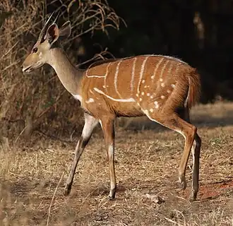 Tragelaphus is a genus of medium-to-large-sized spiral-horned antelopes. It contains several species of bovines, all of which are relatively antelope-like. Species in this genus tend to be large in size and lightly built, and have long necks and considerable sexual dimorphism. Elands, including the common eland (Taurotragus oryx), are embedded within this genus, meaning that Taurotragus must be subsumed into Tragelaphus to avoid paraphyly. Alternatively, Taurotragus could be maintained as a separate genus, if the nyala and the lesser kudu are relocated to their own monospecific genera, respectively Nyala and Ammelaphus. Strepsiceros is a generic synonym.[2] Genus Boocercus formerly contained T. eurycerus.[3] The name "Tragelaphus" comes from the mythical tragelaph.