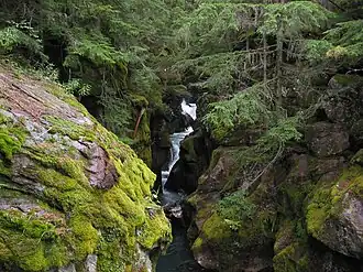 The Trail of the Cedars is a hiking trail accessible from Going-to-the-Sun Road in Glacier National Park, Montana.[1] The .60-mile (0.97 km) path is paved and has a raised boardwalk in some sections. Some of the cedars visible are over 80 feet (24 m) tall. The trail splits into two sections: one loops, while the other continues to Avalanche Lake which can reached after a 2-mile (3.2 km) hike with a 500-foot (150 m) elevation gain.[2] In the middle of the half loop is a beautiful waterfall that has carved through colorful rock to make a channeled stream.
