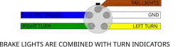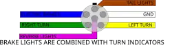 This contact is less common, and may have completely different wiring than that shown here. The wiring is same as for the 6-pin round connector with center pin (Reversing lamps) excluded.