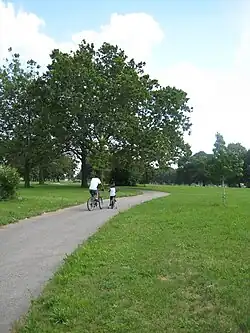 The Conner Creek Greenway is located on Detroit's east side.[3] When completed, it will stretch nine miles (14 km) from M-102 (8 Mile Road) south to the Detroit River, tracing the original Conner Creek. The greenway makes use of shared-use paths, bike lanes, and bike routes. It begins at Maheras Gentry Park (on the Detroit River), travels north past the Detroit City Airport, and up to Eight Mile Road.