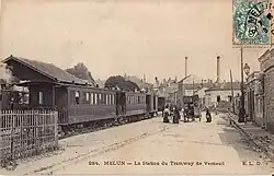 The tramway did not stop directly at Melun station. The Mail Gaillardon was located almost two kilometers from the main station,[50] and the two stations were connected by the Melun tramway, which started near the PLM station and stopped at Rue Saint-Louis, close to the Verneuil tram stop. This urban tramway linked the two stops until 31 January 1917, when its operation ceased due to the deteriorated condition of the tracks.[51] After January 1917, a bus service replaced this connection.[52]