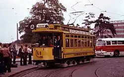 Two railcars have been preserved as historic vehicles: Railcar 68 (ex BVG 5366) was restored to its original condition in 1973 and was in service until 1990. However, changes in legislation led to its decommissioning in 1990. Since 1993, the vehicle has been in the Monumentenhalle of the German Museum of Technology Berlin.[19] Railcar 218 (ex BVG 5403) came to Woltersdorf in 2008 and was refurbished there until the 100th anniversary of operation of the Woltersdorfer Straßenbahn tramway in May 2013 and then presented.[20] The former sidecar 37 (ex BVG 3225) was used as a sheepfold after its time in service in Dessau; no further information is available about its whereabouts.