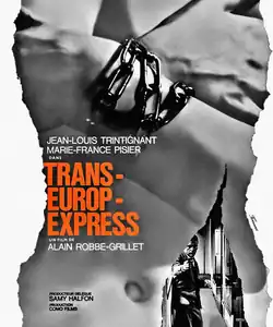 Trans-Europ-Express is a 1966 experimental film written and directed by Alain Robbe-Grillet and starring Jean-Louis Trintignant and Marie-France Pisier. The title refers to the Trans Europ Express, at the time an international rail network in Europe. A frame story shows a creative team devising a film plot during a train journey to Antwerp, intercut with a film-within-a-film about a novice cocaine smuggler and a prostitute that enacts their outline imperfectly.