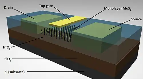 - ^ Radisavljevic, B.; Radenovic, A.; Brivio, J.; Giacometti, V.; Kis, A. (2011). "Single-layer MoS2 transistors". Nature Nanotechnology. 6 (3): 147–50. Bibcode:2011NatNa...6..147R. doi:10.1038/nnano.2010.279. PMID 21278752.