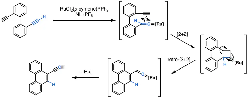 Cycloadditions can occur on metal vinylidenes at either the M=Cα or Cα=Cβ bonds. These can serve in both [2+2] and [4+2] cycloadditions with a variety of cycloaddition partners. For example, Takanori Matsuda and coworkers reported the transformation of 2,2'-ethynyl-biphenyls into ethynyl-phenanthrenes using ruthenium catalysis.[12] This transformation can be rationalized by the initial formation of a ruthenium vinylidenes, followed by [2+2] cycloaddition onto the pendent alkyne. The formed cyclobutene then undergoes retro-[2+2] to the phenanthrene-substituted ruthenium vinylidene. Lastly, 1,2-H migration and de-coordination of the ruthenium complex (i.e. the steps of ruthenium vinylidene formation in reverse) gives the observed product.