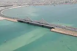 The widening of roads in the old districts of Manama and the development of a national network linking the capital to other settlements commenced as early as the arrival of the first car in 1914.[3] Due to the continuous increase in the number of cars, a series of ring roads were constructed in Bahrain, notably Isa Al Kabeer Avenue in the 1930s, Exhibition Avenue in the 1960s and Al Fateh Highway in the 1980s.[3] To the north, the foreshore used to be around Government Avenue in the 1920s but it shifted to a new road, King Faisal Road, in the early 1930s which became the coastal road.[3] To the east, a bridge connected Manama to Muharraq since 1929, a new causeway was built in 1941 which replaced the old wooden bridge.[3] Vehicle movement between the two islands peaked after the construction of the Bahrain International Airport in 1932.[3]