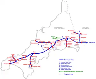 As noted above, five branch lines serve Cornwall. Four have been designated as Community rail lines and are promoted by the Devon and Cornwall Rail Partnership. The fifth, to Newquay, carries local Community Rail trains but the line itself cannot be designated because of the presence of intercity and freight trains. They are: