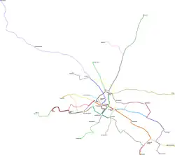 The tramway system is the backbone of public transport in Dresden. DVB operate twelve routes on a 200 km network.[3] On the major lines through the inner city, where different routes intertwine, vehicles run up to every two minutes. Different routes can be identified by a route number scheme, which also extends to local and regional bus services, as well as a colour code which has by now only been applied to the official network diagram of DVB. On all tramway routes, a general 10-minute headway is offered on weekdays, extending to 15 minutes on Saturday, Sunday and in the evening. The system boasts a daily 24 hour service.