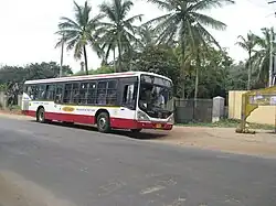The most popular mode of public transport in the city is KSRTC city buses coming under MCTD Division. Buses are available to all locations in the city as well as villages and towns outside the city. KSRTC MCTD Division has a fleet of around 500 buses. These buses are majorly semi low floor Non-AC city buses. Other buses include AC Volvo buses and older high floor buses.[8] Mysore was the first city in India to implement Intelligent Transport System (ITS) with funding from World Bank.[9] There are 5 IMTC Bus stands in Mysore at Kuvempunagar, Sathgalli, R.S Naidunagar, Yelwala and Chamundi Hills. The main bus stand has 5 bays and 3 bays for suburban busses which ply to towns and villages of the district, Subways and free Wifi facilities.[10]