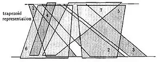 Algorithms for trapezoid graphs should be compared with algorithms for general co-comparability graphs. For this larger class of graphs, the maximum independent set and the minimum clique cover problem can be solved in time.[5] Dagan et al. first proposed an algorithm for coloring trapezoid graphs, where n is the number of nodes and k is the chromatic number of the graph. Later, using the box representation of trapezoid graphs, Felsner published algorithms for chromatic number, weighted independent set, clique cover, and maximum weighted clique. These algorithms all require space. These algorithms rely on the associated dominance in the box representation that allows sweeping line algorithms to be used. Felsner proposes using balanced trees that can do insert, delete, and query operations in time, which results in algorithms.