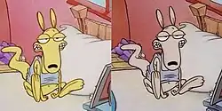 At night, Rocko takes a bath with Spunky, apparently able to take out the trash in time and expresses his gratefulness for Spunky's companionship, only to realize that Spunky had the slime ball in his mouth the whole time. The slime ball explodes after coming in contact with water.