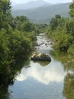 The Travo rises to the southwest of the 2,134 metres (7,001 ft) Monte Incudine in the Alcudina massif of Corse-du-Sud.[1] It rises at an elevation of 1,743 metres (5,719 ft) in the southeast of the Zicavo commune.[2] It flows north through Zicavo to its border with Cozzano. It then turns east, enters Haute-Corse, and flows through Chisa and then between Ventiseri and Solaro to enter the Tyrrhenian Sea just south of the Solenzara Air Base.[1]