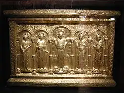 The Antependium of Basel is a golden altar frontal donated by emperor Henry II, possibly in the year 1019. It is considered to be one of the masterpieces of Ottonian art. The Antependium is a thin golden plate on an oak wood base, 120 cm high and 178 cm wide. It is decorated with repoussé images of five figures standing in arcades: Saint Benedict of Nursia, the archangel Michael, Christ the Salvator and the archangels Gabriel and Raphael. Small figures of Emperor Henry and his wife Cunigunde are crouching and praying at the feet of Christ. In the spandrels above, amongst dense foliage containing grapes, pomegranates, birds and mammals, the four cardinal virtues are represented.