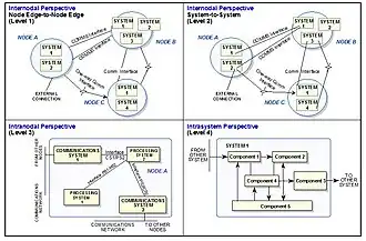 The System Interface Description (SID) links together the Organizational and Infrastructure Views by depicting the assignments of systems and their interfaces to the nodes and needlines described in the Node Connectivity Description. The Node Connectivity Description for a given architecture shows nodes (not always defined in physical terms), while the System Interface Description depicts the systems corresponding to the system nodes. The System Interface Description can be produced at four levels, as described below. Level 1 is an essential work product, while Levels 2, 3, and 4 are supporting work products.[2]