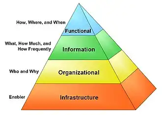 The TEAF matrix is a simplified portrayal of an EA structure to aid in understanding important EA aspects from various vantage points (views and perspectives). The TEAF matrix aims to provide a simple, uniform structure to an entire framework. As depicted in the figure, the TEAF matrix consists of four architectural views (Functional, Information, Organizational, and Infrastructure), which are shown as columns, and four perspectives (Planner, Owner, Designer, and Builder), which appear as rows. The TEAF matrix is a four-by-four matrix with a total of 16 cells. The views and perspectives are described in the following sections.[2]