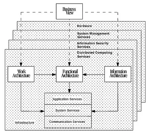 The Work Architecture is the "where" of information systems which depicts the decentralization of the business, the description of the work organizations to business locations, and the communications and coordination between these locations. The Infrastructure is the "enabler" of information systems which describes the supporting services, computing platforms, and internal and external interfaces needed to provide technology environments within which information systems run.[1]