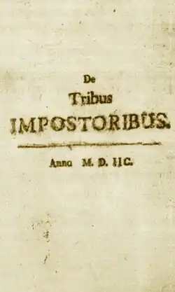 The Treatise of the Three Impostors (Latin: De Tribus Impostoribus) was a long-rumored book denying all three Abrahamic religions: Christianity, Judaism, and Islam, with the "impostors" of the title being Jesus, Moses, and Muhammad. Hearsay concerning such a book surfaces by the 13th century and circulates through the 17th century. Authorship of the hoax book was variously ascribed to Jewish, Muslim, and Christian writers.[1] Fabrications of the text eventually begin clandestine circulation, with a notable French underground edition Traité sur les trois imposteurs first appearing in 1719.