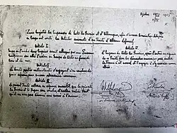 Although Tsar Nicholas had signed the treaty, his government did not ratify it due to the preexisting Franco-Russian Alliance. Russian Prime Minister Sergey Witte and Foreign Minister Vladimir Lambsdorff were not present at the signing nor consulted beforehand. They insisted that the treaty should not come into effect unless it was approved and signed by France. Lambsdorff informed the Tsar that it was unacceptable to make the same promise to two governments with opposing interests.[5] The Tsar yielded to their pressure, causing consternation for the Kaiser, who rebuked his cousin: "We joined hands and signed before God, who heard our vows!... What is signed, is signed! and God is our testator!"[6] Wilhelm's chancellor, Count Bernhard von Bülow, also refused to sign the treaty because the Kaiser had added an amendment to the draft. This amendment, which limited the treaty to Europe, was added against the advice of the Foreign Office.[7]