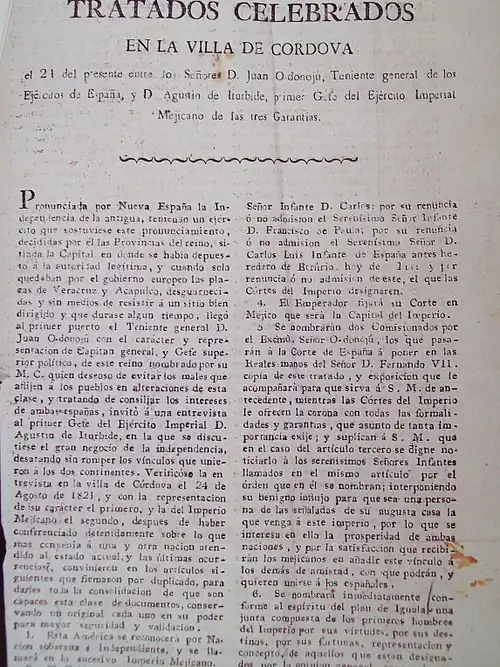 The Treaty of Córdoba established Mexican independence from Spain at the conclusion of the Mexican War of Independence. It was signed on August 24, 1821 in Córdoba, Veracruz, Mexico. The signatories were the head of the Army of the Three Guarantees, Agustín de Iturbide, and, acting on behalf of the Spanish government, Jefe Político Superior Juan O'Donojú. The treaty has 17 articles, which developed the proposals of the Plan of Iguala.[1] The Treaty is the first document in which Spanish (without authorization) and Mexican officials accept the liberty of what will become the First Mexican Empire, but it is not today recognized as the foundational moment, since these ideas are often attributed to the Grito de Dolores (September 16, 1810). The treaty was rejected by the Spanish government, publishing this determination in Madrid on February 13 and 14, 1822.[2]