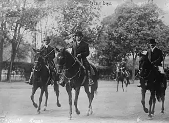These social group were in turn opposed by the more reactionary elements within Díaz's government, mostly concentrated in the Federal Army, who thought that the rebels should be dealt with through brute force.[2] This faction was represented by Gen. Victoriano Huerta, who would later carry out an attempted coup d'état against Madero.[2] Likewise, Gen.--and potential successor to Díaz--Bernardo Reyes stated in a letter to Limantour that "the repression [against the insurrectionists] should be carried out with the greatest energy, punishing without any pity anyone participating in the armed struggle".[2] In the end, however, Díaz dismissed the advice from his generals as "Custer-like bluster" and chose to seek peace with the moderate wing of the revolution. Limantour had finally managed to persuade him to resign.[10]