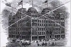 The fourth hotel was designed by John M. Van Osdel, who had designed the previous third hotel. It opened its doors in 1873. It stood six floors.[1] It was constructed James Couch and the estate of his brother Ira Couch, who had himself passed away in 1857.[5][6] The rebuilt hotel remained along with the Palmer House, Grand Pacific Hotel and the Sherman House as a leading hotel after the Great Chicago Fire.[2] It was built in the commercial palazzo architecture style of the day and claimed to be fireproof.[2] James Couch and his son Ira Couch (not to be confused with his late brother of the same name) were the proprietors of the new fourth incarnation of the hotel at its opening.[3] The hotel was one of the city's "big four" post-fire hotels, the other three being the Grand Pacific, Palmer House, and the Sherman House.[16]