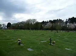 The cemetery is of a lawn style with only bronze or granite memorial plaques laid flat allowed.